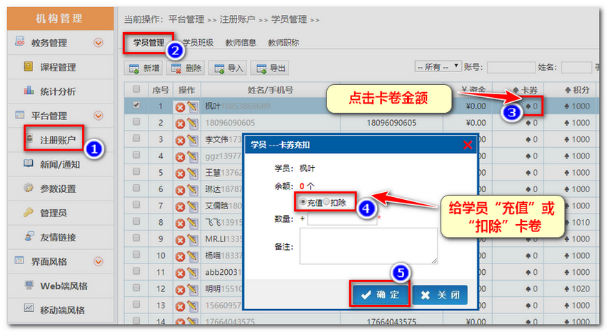 2. 操作提示:登录普通管理员界面—平台管理—注册账户—点击某学员的资金数—选择“充值”或“扣除”—输入充值或扣除的金额数—确定。