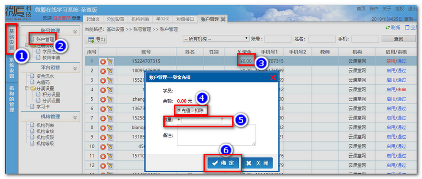 1. 操作提示:登录系统管理员界面—基础设置—账户管理—点击学员的资金数—选择“充值”或“扣除”—输入充值或扣除的金额数—确定。