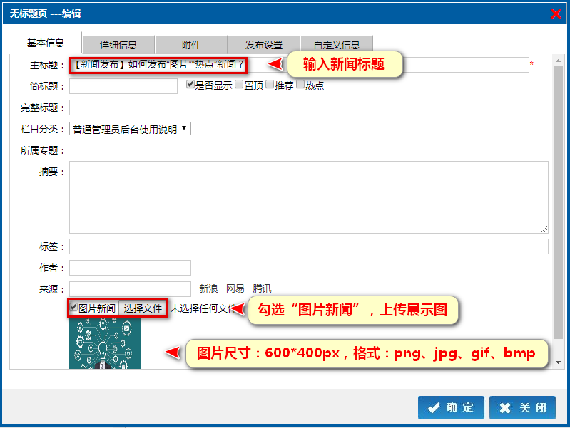【图片新闻】:图片新闻需要上传新闻缩略图,图片的最佳尺寸为:600*400px,支持的格式为:png、jpg、gif、bmp