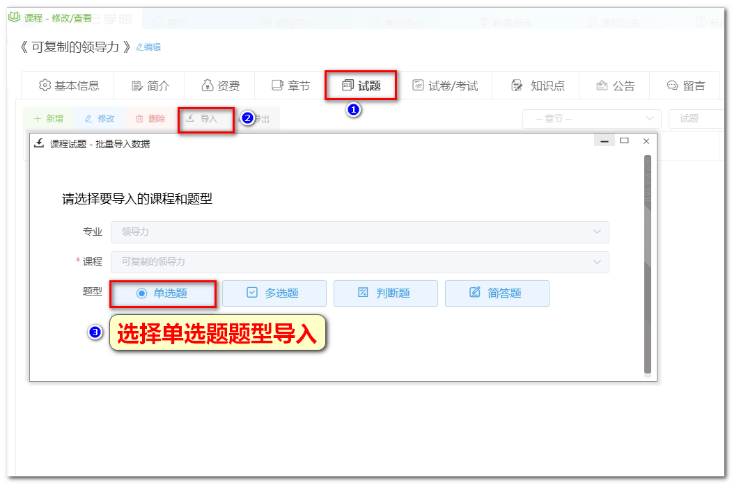 操作提示:进入课程编辑>>>试题>>>导入>>>选择单选题题型>>>点击上传文件>>>将整理好的单选题模板数据上传>>>点击试题数据>>>导入数据>>>显示成功导入多少条数据