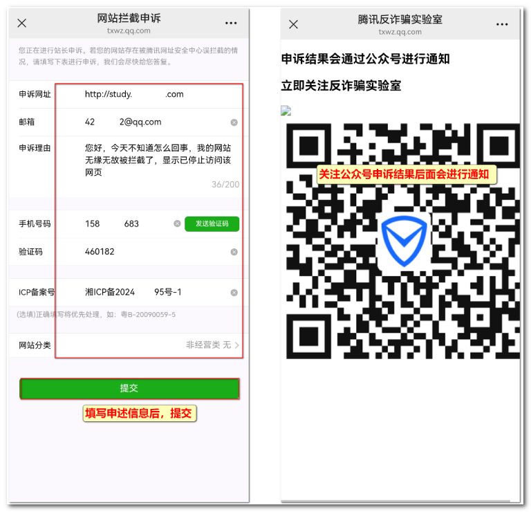 ④网站拦截填写申诉信息:申诉网址、邮箱、申诉理由(如“网站内容无违规,请核实解封”)、手机号码、验证码、ICP备案号(如有)、网站分类。填写后,关注公众号申诉结果会进行通知。