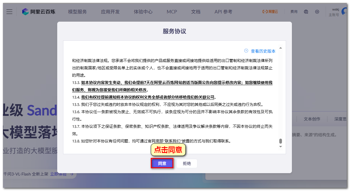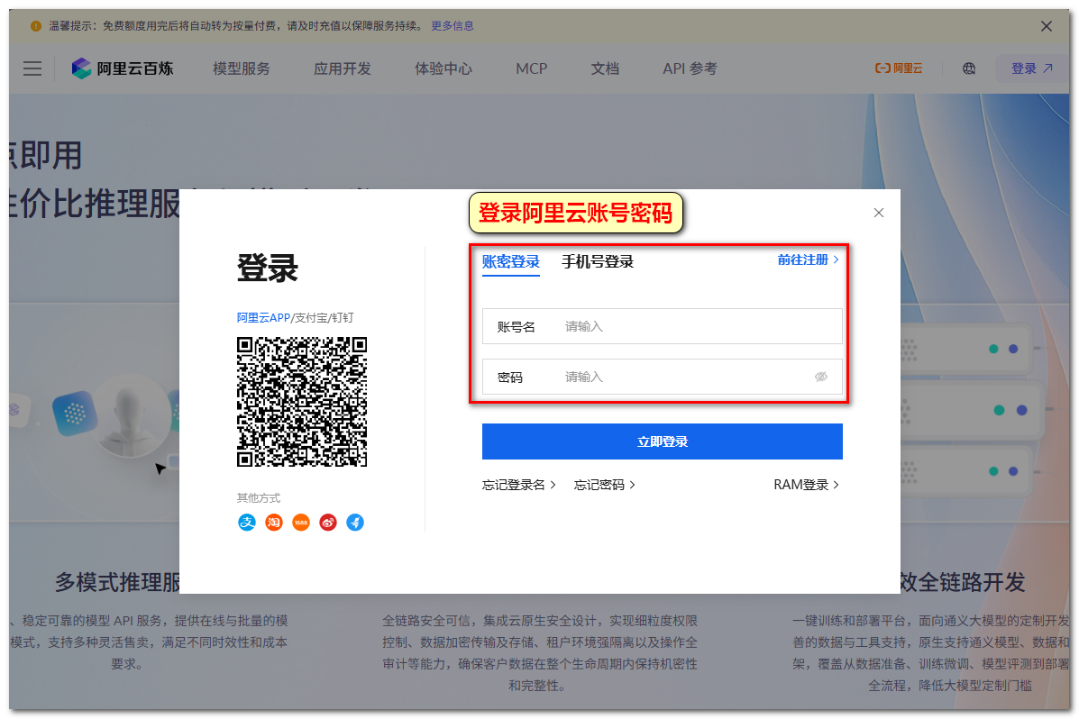 注意:阿里云百炼平台账号即为阿里云账号,有阿里云账号登录即可,没有需要注册。