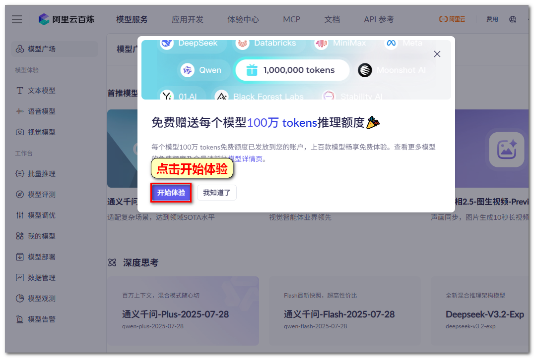 3、 弹出弹窗“免费赠送每个模型100万 tokens推理额度”,点击“开始体验”。