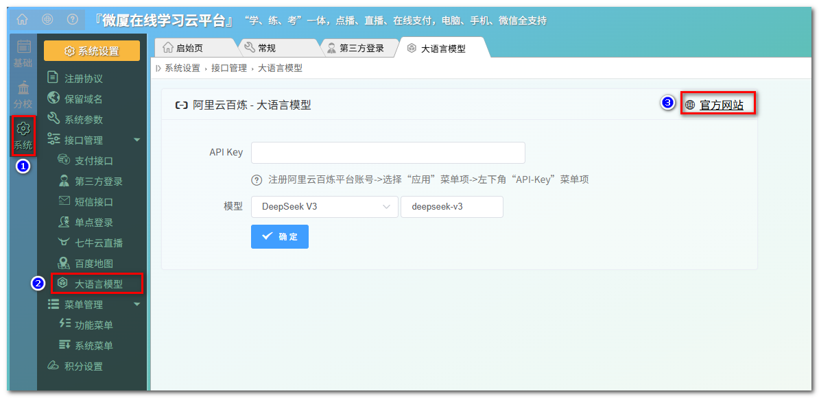 操作流程:超管后台---系统---接口管理---大语言模型---官方网站---登录阿里云账号