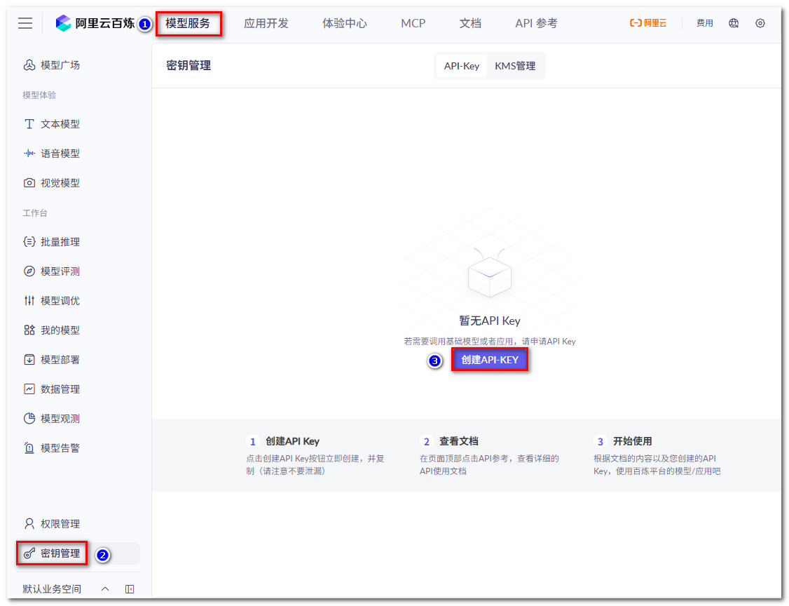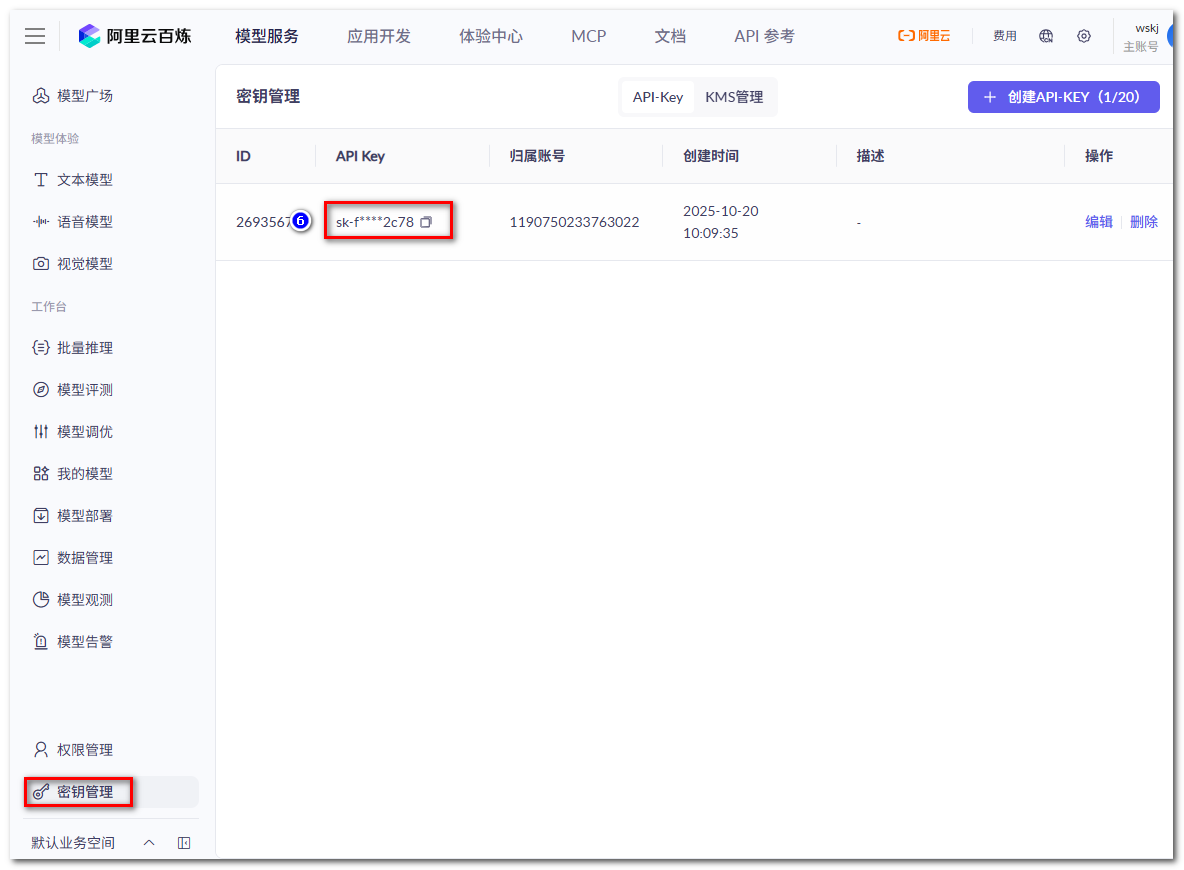 操作流程:阿里云百炼---模型服务---密钥管理---点击创建API-KEY---勾选归属账号---点击确定---复制API Key