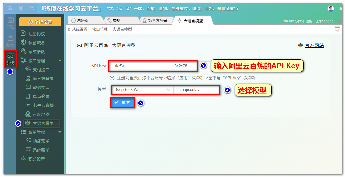 操作流程:超管后台---系统---接口管理---大语言模型---粘贴API Key---选择模型---点击确定